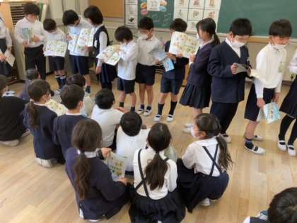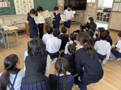 教科書をもとに英語で読み聞かせです。