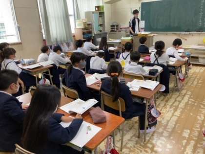 「鳥獣戯画」の絵を見て、動物たちが何をしているのか想像して話をする学習です。