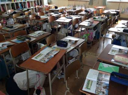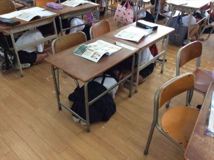 屋外スピーカーの声や警報音に合わせ、子どもたちは、机の下に避難しました。写真は1年生と4年生の様子です。