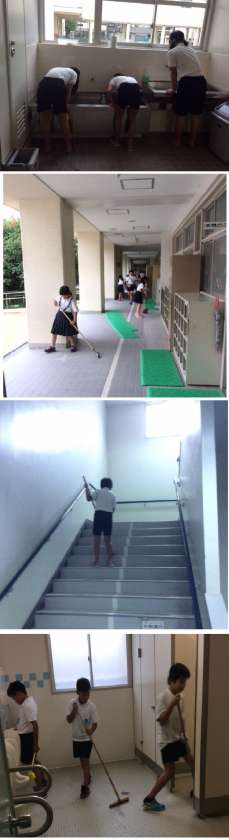 午後1時25分から40分は、全校一斉清掃の時間です。子どもたちは、自分たちの教室のほか、学年に応じて、特別教室や廊下、階段等公共の場所を清掃します。