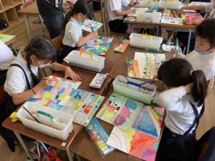 いろいろな線を描いて、その中に色を塗っていきます。自分で色を作ったり濃淡で表したりしてていねいに塗っていきます。