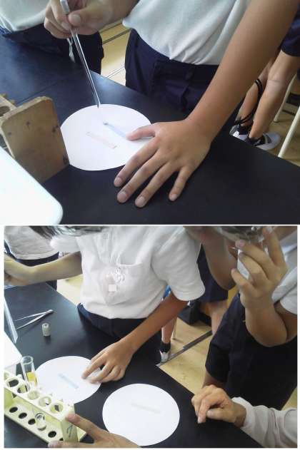 子どもたちは、8種類の水溶液がリトマス紙の色の変化で3つのグループに分けられることを発見し、それぞれ、酸性、中性、アルカリ性という名前があることを知りました。