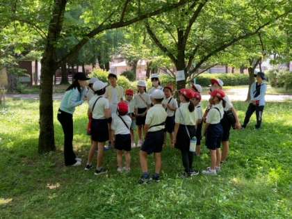 公園では縦割り班キッズファミリー班でオリエンテーリングを楽しみます。