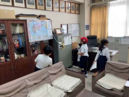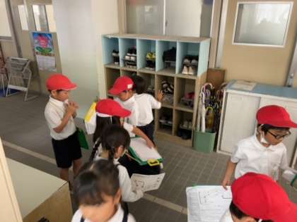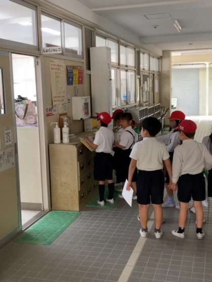 2年生が1年生を連れて、学校たんけんをしました。それぞれの場所では2年生が部屋の説明をします。
