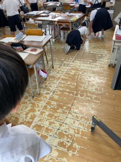 巻き尺を使って、教室の縦と横の長さを調べてみました。