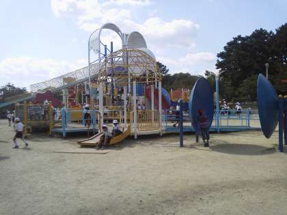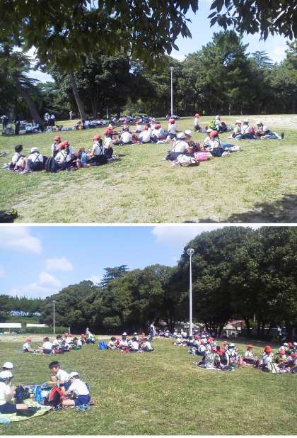 友だちと輪になってお弁当とおやつを楽しみました。そして、子どもの楽園でいろいろな遊具で遊び、予定通り帰校しました。