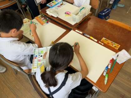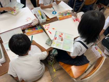 絵の具もにじみやぼかし、筆をはじいて色を付けていきます。