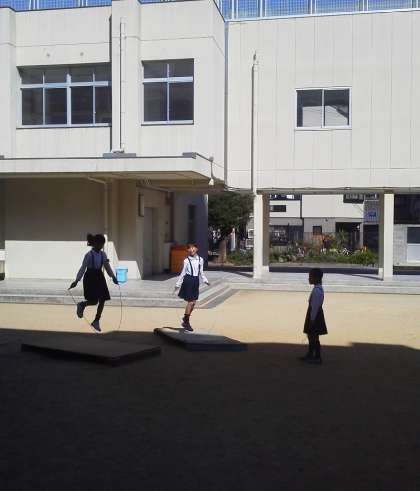 運動場では、ボール運動、中庭では、なわとびに挑戦しています!