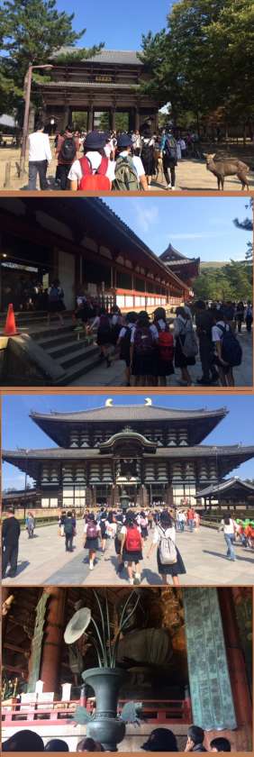 奈良公園ではたくさんの鹿が出迎えてくれました。南大門を入ると東大寺です。大仏殿の大きさや大仏の大きさにびっくり!二月堂では、古都の秋の景観を楽しみ、正倉院では、校倉造りを間近に見学しました。若草山を見ながら、奈良公園まで、とにかく歩きに歩きました。歩き疲れ、すっかりおなかがすきました。みんなで食べたお弁当のおいしかったこと!