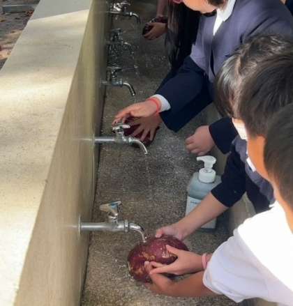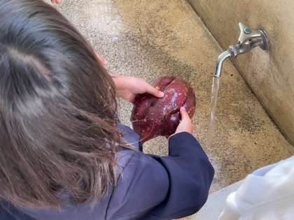 先日お芋ほりをしましたが、そのお芋の土を落としてきれいに洗っています。