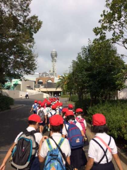 中庭であいさつをして学校を出発し、地下鉄都島駅まで二列に並んで歩きました。