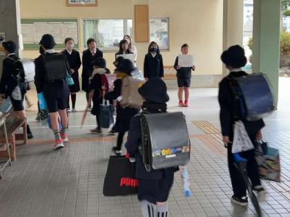児童会の人たちが、登校時に玄関であいさつを呼びかけてくれています。