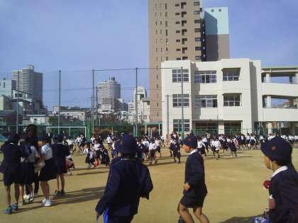 1次避難(机の下に入り身を守る)の次に2次避難で運動場に退避しました。