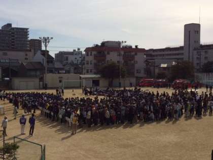 児童代表、地域住民代表の避難完了報告の後、連合町会長と学校長からあいさつがあり、本日の合同防災訓練の趣旨や目指すべき内容について説明がありました。