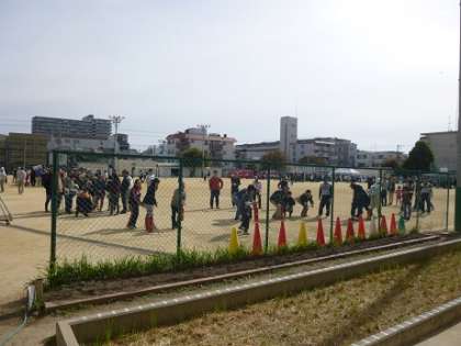 子どもたちが体験を終えた頃、高倉地域の皆さんが、運動場等で町会毎に子どもたちと同じ防災体験をされていました。
