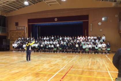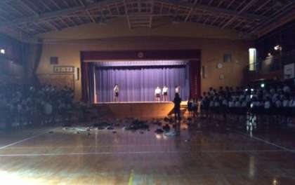 4年生は、国語で学習した作品の群読を中心に発表します。今日は、講堂で大きくわかりやすい声を出す練習をしていました。2階の印をめがけて、頭の上から声をだそうと頑張っていました。
