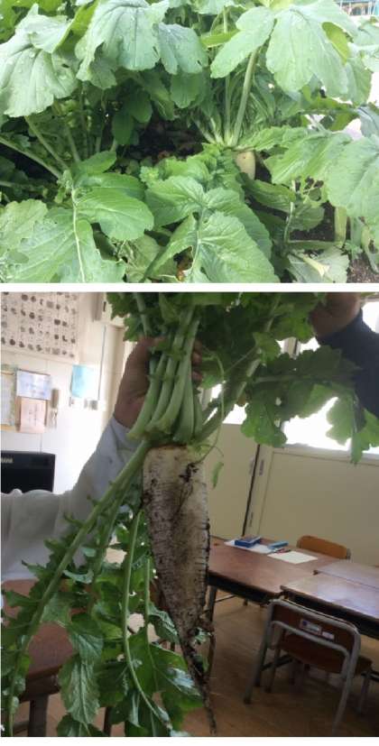 学習園では飼育栽培委員会児童が9月に種をまいた大根が大きく育ってきました。もっと大きくするために、間引きをした大根です。十分立派に育っていますね!大根は冬が旬です。自家製の大根は葉っぱまでおいしそうです!