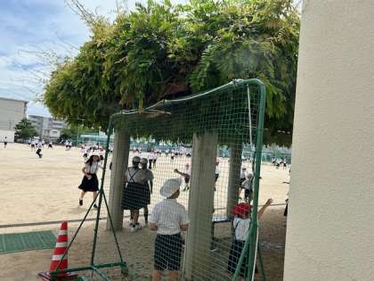 藤棚のところに防球ネットを置き、ミストが出るように管理作業員さんに設置していただきました。