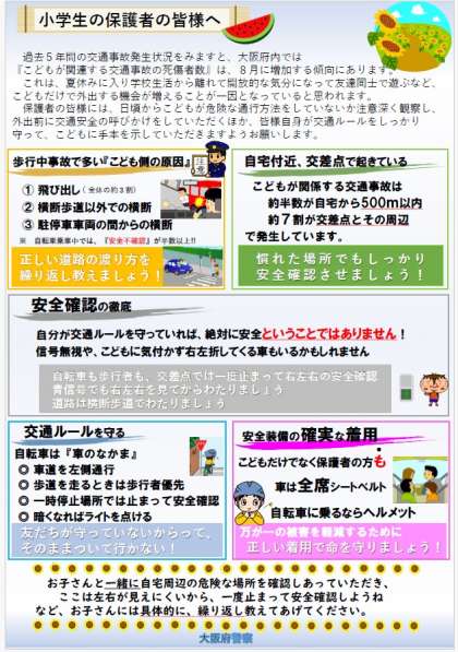 過去5年間の交通事故発生状況をみますと、大阪府内では『こどもが関連する交通事故の死傷者数』は、8月に増加する傾向にあります。これは、夏休みに入り学校生活から離れて開放的な気分になって友達同士で遊ぶなど、こどもだけで外出する機会が増えることが一因となっていると思われます。保護者の皆様には、日頃からこどもが危険な通行方法をしていないか注意深く観察し、外出前に交通安全の呼びかけをしていただくほか、皆様自身が交通ルールをしっかり守って、こどもに手本を示していただきますようお願いします。