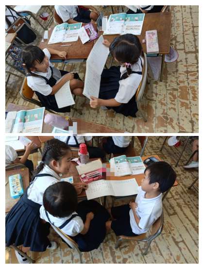 となりどうしがペアになってノートを見せ合いながらお互いの考えを話し合います。そのあとで、クラス全体で発表していきました。