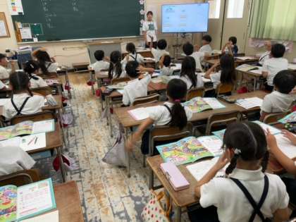 ジェットコースター3台に5人ずつ乗っている絵を見て、「5の3つ分」というように数の表し方を確認しました。