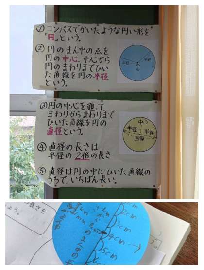 やはり円の紙を折ることで円の中心点が見つけられるという考え方が目立ちましたが、中には円にたくさんの直線を引いていちばん長いのが直径であるという考えを発表している子もいました。