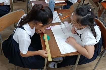 子どもたちは ノートの円に定規を当てたり 先生から配られた円の折り紙を折ったりしながら円の中心点を見つけるために思考錯誤しました。隣近所の友だちと自分の考えたことを話したり聞いたりしながら確かめ合っていました。相談しながら自分の考えを広げ、深めていきました。