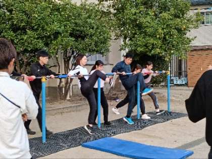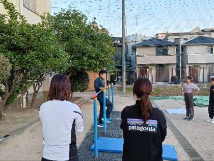 その後、逆上がりのよくある失敗例とその欠点を直していく指導法を実際に鉄棒を使って確かめていました。