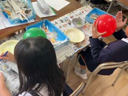 膨らませた風船に紙を張り付けていきます。