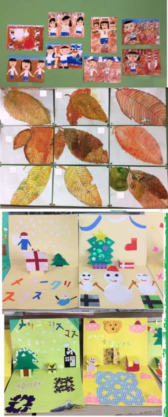 2年生は、楽しさが伝わってくる運動会の絵です。3年生は、落ち葉を彩よく描いています。4年生は、立体的なカードを工夫して作っています。