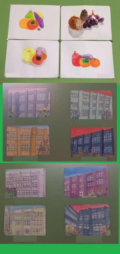 5年生は、果物を写実的に描きました。6年生は、迫力満点に校舎を描いています。