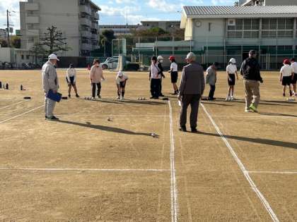 地域の老人会の方々にペタンクを教えていただきました。前日からコートのラインを引くなど全て準備していただき、当日はルールを教えていただき楽しく活動できました。