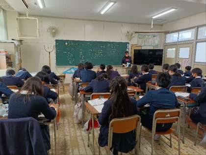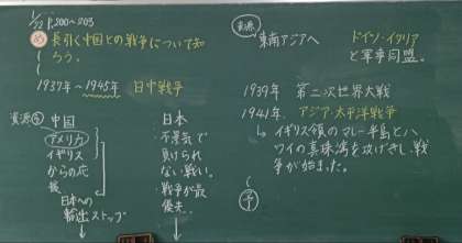 6年生が、太平洋戦争について学習しています。教科書や資料で調べていく前に、中国と戦争していた日本は、なぜアメリカやイギリスとも戦争をすることになったのかを子どもたちが予想しました。