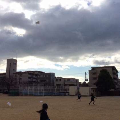 運動場は、少し風もふいて、とっても寒いのですが、凧上げをするのにもってこいのお天気です。糸がもつれたり、上手く上がらなかったりもしましたが、糸をどのくらい出したらいいのか、凧を離してどんなふうに走ればいいのか、試行錯誤しながら、元気に凧上げに挑戦していました。時間がたつにつれ、友だちの様子を見たり、こつを発見したりして風をつかまえ、高く上げれるようになってきました。運動場では、思いっきり走ることができるので安心して凧上げができますね!