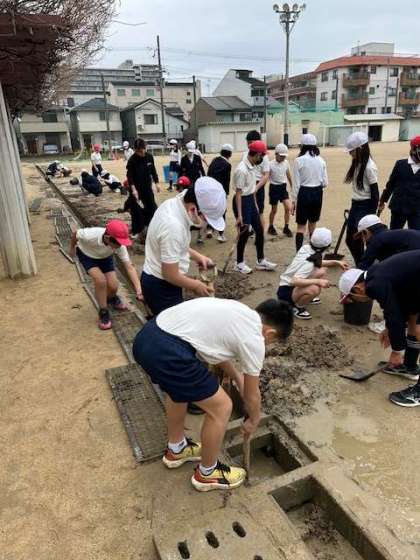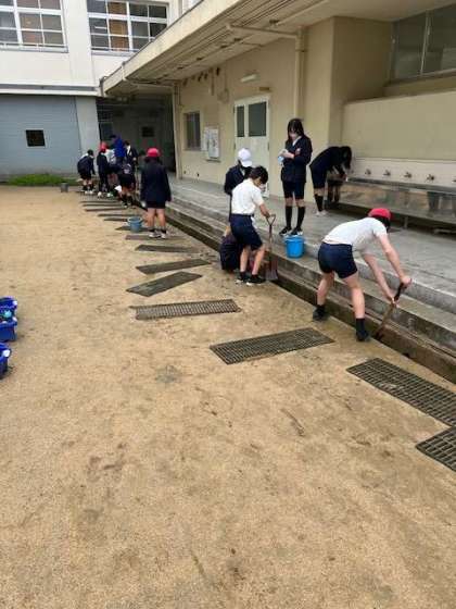 卒業前に学校のために今自分たちができることをしようということで、中庭や運動場の側溝の掃除をしてくれました。