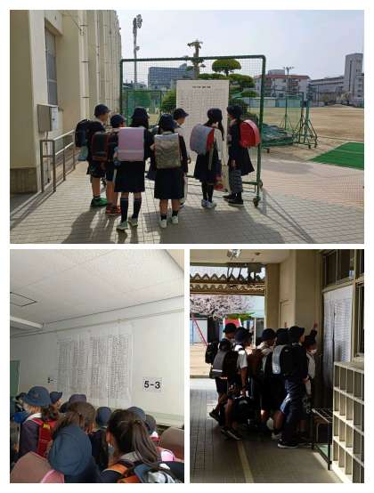 くつ箱付近に学級名簿が貼ってあり、子どもたちはそれを見て自分のクラスと出席番号を把握します。靴箱に靴を入れて自分の教室に入ったら,新しい担任の先生が待っています。