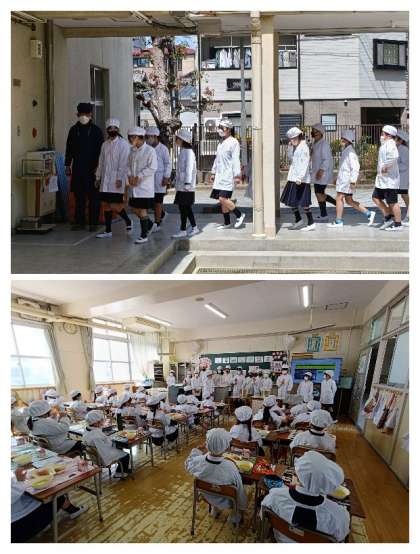 今日から給食が始まりました。1年生は まだ配膳 などはできません。そこで6年生の登場です。6年生のお兄さんお姉さんが1年生の教室まで給食の食缶を運びます。さらに、今日は初日なので、6年生が1年生の目の前で配膳の仕方を見せてくれました。6年生のお手本となる配膳が予想以上にテキパキと 素早くできたので写真が撮れませんでした。
