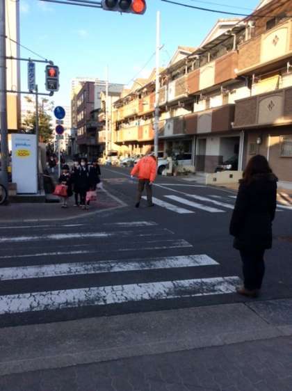 寒い朝もオレンジ隊の皆様に見守られ、 元気に登校!