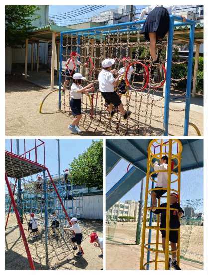 1年生が夢中で遊んでいます。私もすべり台を滑ってみましたが、なかなかの角度と長さで楽しめました。