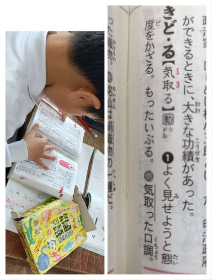 物語文のある場面を豊かに読み取り、音読に生かすというねらいです。まず1枚目の写真左にある「気どった声」を表現したい。「気どった」を辞書で調べますが載ってない。そう、「気取る」と言い切りの形に直して調べないといけないことに気づく子どもたち。やっと見つけて、みんなで意味を確認して、いよいよ音読。子どもたちは、次々と手をあげて発表していきました!「はあい、目ざましラッパ、サンキューサンキュー!」録音して保存したいくらい生き生きとした表現でした。