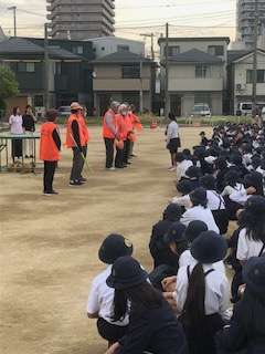 登下校に通学路に立って、みんなの安全を見守ってくださるオレンジ隊の紹介の会を全校朝会のあとに行いました。