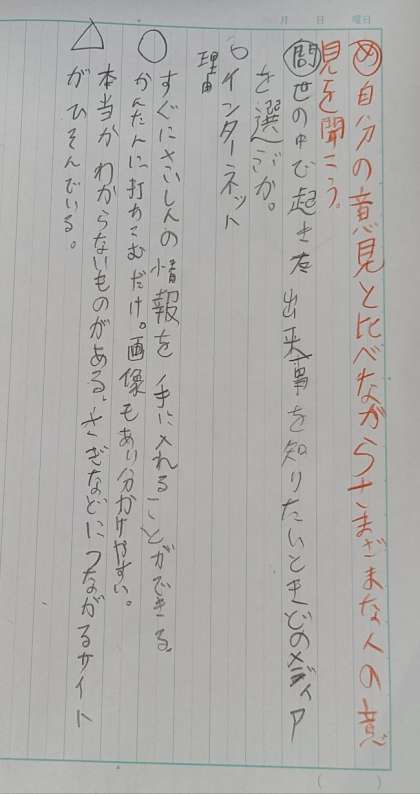 正確性は、新聞とテレビに軍配が上がりました。インターネットは怪しい 情報が混じっていたり、大げさに伝えていることもある。写真のノートの子は、詐欺サイトに誘導される危険について記述していました。でも、インターネットは自分の欲しい情報を検索することができる。つまり欲しい情報を欲しい時に得られるという大きなメリットがある。テレビは、自分の欲しい情報が出ないかもしれない。要するに受け身のメディアであると。