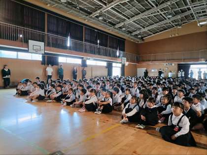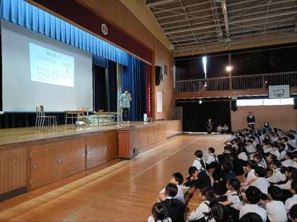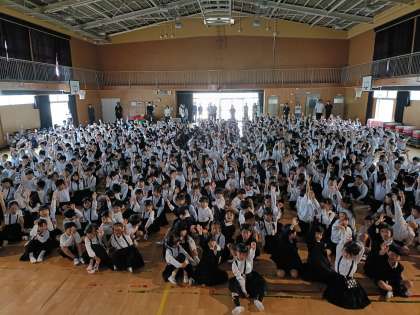 2枚目の写真は、「もし、いじめられる子がいたら助けてあげられますか?」と質問して全員が助けてあげられると答え、手を上げている写真です。とても嬉しい風景だったので舞台に上がって写真を撮りました。