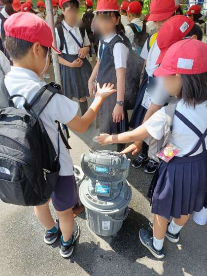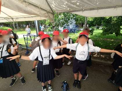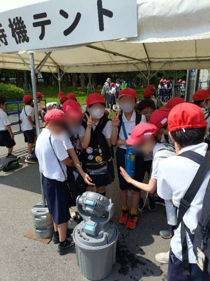 隣のテントの 柏原市から来た中学生に話しかけたり、暑くもないのにミストに群がって、顔面や腕をビチョビチョにして楽しんだりしています。