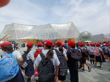 パビリオンに入場します。入場の待ち時間の間、お茶休憩です。本当にいい天気で良かったです。