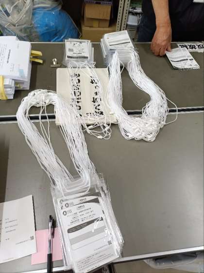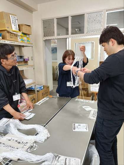写真は、学校に届いた万博のチケットを首からぶら下げられるように1枚1枚ホルダーに入れているところです。