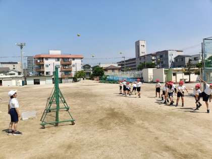 理屈では、斜め45度の角度で空に向かって投げると最も距離が出ますが、3年生に説明したとて、なかなか出来るものでもありません。そこて、この写真の3年生がやっている練習法です。高さのある防球ネットを前に置き、その防球ネットを超える高さにボールを投げることで、ボールの投げる角度を斜め45度に近づけるというものです。少しでもいい記録が出せるように体育部の先生方が工夫しています。