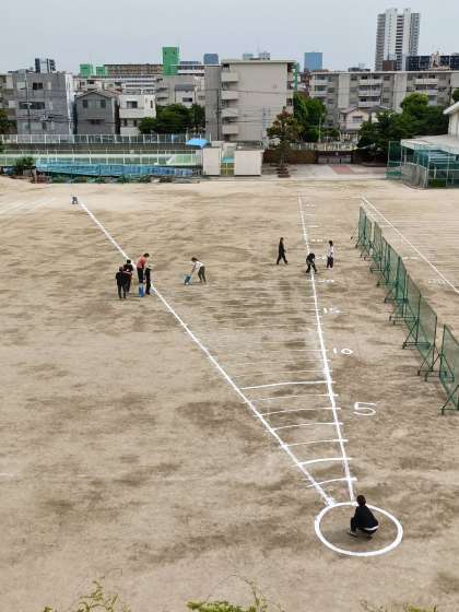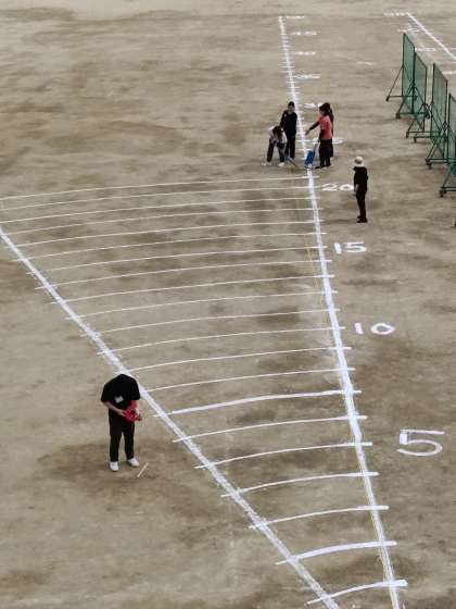 ソフトボール投げの同心円を描くのが難しくて、教員歴が長くなるとこれがさっさと出来るようになるんですけどね…。