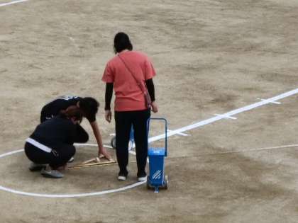 運動場に、50メートル走のラインと、ソフトボール投げのラインを引きました。1、2年生の先生が子どもたちが下校した後、すぐ運動場に出て作業しました。