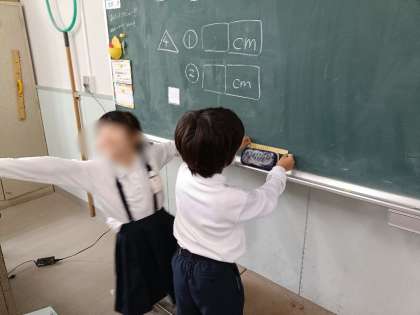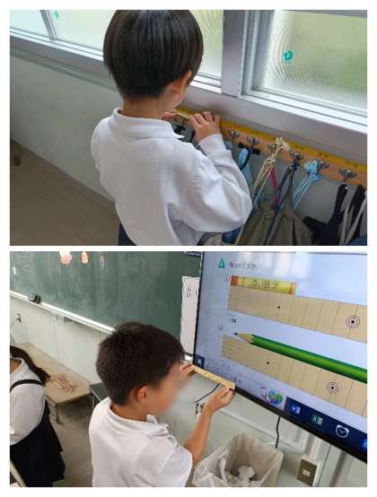 cm(センチメートル)を習ったので、付属のものさしであちこち計る計る計る…。担任の先生の手の長さまで計っています。